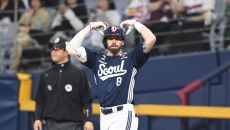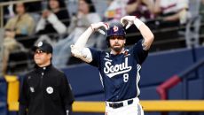 두산 케이브가 24일 서울 고척스카이돔에서 열린 2025 KBO리그 키움과 경기 4회초 2사2루 1타점 우전안타를 친 후 세리- 2025-04-24 19:38