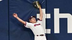 [사진]양의지 안타 훔치는 임재열의 펜스 앞 수비