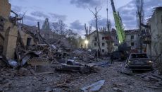 ▲ 우크라이나 키이우의 한 주택가에서 구조대원들이 러시아의 공격으로 피해를 입은 주택 잔해를 치우고 있다. 한밤중 우크라이나- 2025-04-24 18:44
