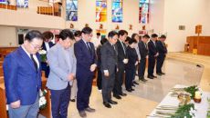 강기정 광주시장이 24일 시청 실·국장들과 천주교 광주대교구청 성당에 마련된 프란치스코 교황 분향소를 찾아 조문하고 있다. 광- 2025-04-24 18:24
