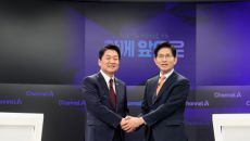 4일 서울 종로구 동아미디어센터 오픈스튜디오에서 국민의힘 대선 2차 경선 진출자인 안철수(왼쪽), 김문수 후보가 토론전 손을- 2025-04-24 18:07