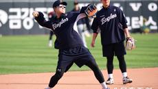 24일 부산 사직야구장에서 열리는 롯데와 한화의 경기. 수비 훈련을 하고 있는 채은성, 노시환. 부산=송정헌 기자songs@s- 2025-04-24 17:03