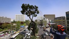 24일 서울 서초역사거리에 있는 향나무 ‘천년향’을 수목관리 업체 직원이 세척하고 있다. 천년향은 서울에서 가장 오래된 향나무- 2025-04-24 21:41