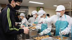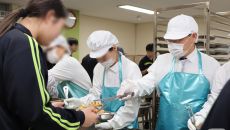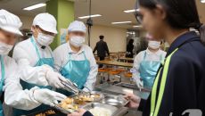 (서울=뉴스1) = 정근식 서울시교육감이 24일 서울 성북구 길음중학교를 방문해 학생들에게 급식 배식을 하고 있다. (서울시교- 2025-04-24 16:00