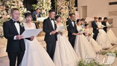 (광주=뉴스1) 이수민 기자 = 장애인 부부 6쌍이 광주에서 감동적인 결혼식을 올렸다. 광주 서구는 24일 광주서구장애인복지관- 2025-04-24 15:43
