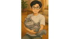 이 그림은 뭘까요? 집으로 보이는 곳에 안경을 쓴 남성이 있고요. 털이 긴 고양이가 귀엽게 안겨있죠. 바로, 한동훈 국민의힘- 2025-04-24 15:18
