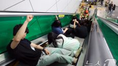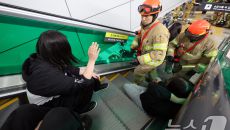 정전으로 멈춘 에스컬레이터에서 구조 작업