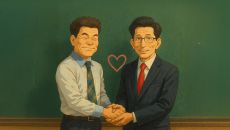 두 사람이 밝은 표정으로 두 손을 맞잡고 있고요. 가운데 칠판에는 하트가 그려져 있죠. 바로, 김문수 국민의힘 경선 후보와 전- 2025-04-24 15:18