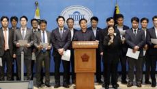 더불어민주당 전정권정치탄압대책위원회 위원들이 24일 국회 소통관에서 문재인 전 대통령 기소 관련 긴급 기자회견을 하고 있다.- 2025-04-24 15:02
