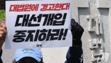 (서울=뉴스1) 김성진 기자 = 촛불행동 회원들이 24일 서울 서초구 대법원 앞에서 대법원의 이재명 대표 사건 비정상 심리 속- 2025-04-24 14:22