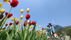 봄 하늘 밑에 활짝 핀 튤립