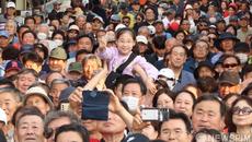 [당진=뉴스핌] 최지환 기자 =김문수 국민의힘 대선후보 지지자들이 25일 충남 당진시장에서 김 후보의 연설을 듣고 호응하고 있- 2025-05-25 19:23