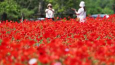 25일 경기 수원시 탑동시민농장에서 시민들이 활짝 핀 양귀비꽃을 배경으로 기념촬영을 하고 있다. 이날 맑고 화창한 날씨로 완연- 2025-05-25 23:23