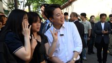 아시아투데이 박성일 기자 = 이준석 개혁신당 대선 후보가 25일 오후 서울 종로구 서순라길 유세에서 시민들과 사진을 찍고 있다- 2025-05-25 17:52