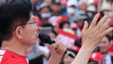 (서산=뉴스1) 김민지 기자 = 김문수 국민의힘 대통령 후보가 25일 오후 충남 서산시 중앙통 로데오거리에서 집중유세를 하고- 2025-05-25 17:48