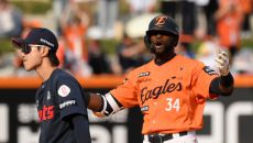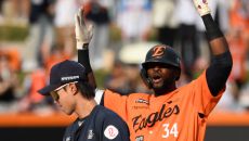 25일 대전 한화생명볼파크에서 열린 한화 이글스와 롯데 자이언츠의 경기. 9회말 한화 플로리얼이 안타를 날린 뒤 환호하고 있다- 2025-05-25 17:10
