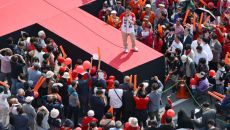 아이 안고 유세하는 김문수