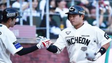 25일 인천 SSG랜더스필드에서 열린 LG-SSG전. 9회말 1사 신범수가 솔로포를 친 후 환영받고 있다. 인천=정재근 기자- 2025-05-25 16:52