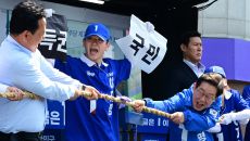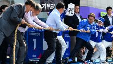 [포토] '국민 vs 기득권' 줄다리기 퍼포먼스 펼치는 이재명