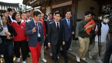 [옥천=뉴스핌] 최지환 기자 = 김문수 국민의힘 대선 후보가 25일 오전 충북 옥천군 육영수 여사 생가 참배에 앞서 아이를 안- 2025-05-25 10:15