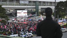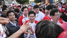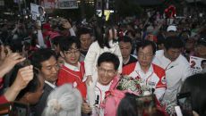 [아산=뉴스핌] 최지환 기자 = 김문수 국민의힘 대선 후보가 25일저녁 충남 아산시 온양온천역 광장에서 유세를 하고 있는 가운- 2025-05-25 20:45