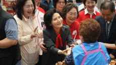 평택 통복시장 상인들과 인사하는 설난영 여사