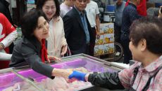 (서울=뉴스1) = 김문수 국민의힘 대통령 후보 배우자 설난영 여사가 25일 경기 평택 통복시장을 방문해 상인들을 만나고 있다- 2025-05-25 20:05