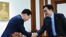 [포토] 신정훈 국회 행정안전위원장과 인사하는 우원식 국회의장