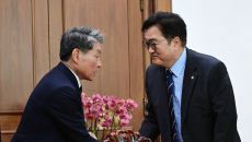 아시아투데이 이병화 기자 = 우원식 국회의장이 7일 국회에서 열린 국민투표법 개정 간담회에서 신정훈 국회 행정안전위원장과 인사- 2026-01-07 10:33