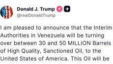 도널드 트럼프 미국 대통령이 6일(현지시간) "베네수엘라 과도 정부가 제재 대상이었던 원유 3000만~5000만배럴을 미국에- 2026-01-07 09:40