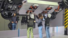 [CES 2026] #흰색 안전모를 쓴 관람객들이 머리 위로 육중하게 들린 자동차 하부 프레임 아래에 섰다. 작업용 조끼처럼- 2026-01-07 09:36