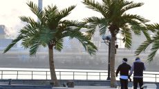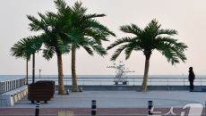 (포항=뉴스1) 최창호 기자 = 7일 경북 포항시 송도해수욕장 평화의 여신상 광장에 조성된 인공 야자수 앞에서 산책 나온 시민- 2026-01-07 09:01