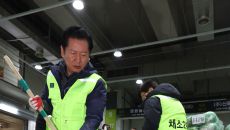 (서울=뉴스1) 신웅수 기자 = 정청래 더불어민주당 대표가 7일 서울 송파구 가락동 농수산물 종합도매시장을 찾아 청소를 하고- 2026-01-07 08:49