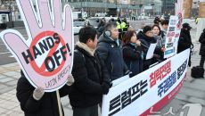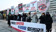 (서울=뉴스1) 김도우 기자 = 평화주권행동 평화너머 활동가들이 7일 서울 종로구 미국대사관인근에서 미국의 베네수엘라 침공을- 2026-01-07 08:46