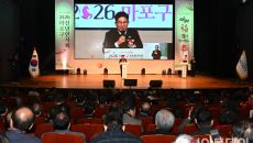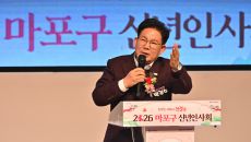 박강수 마포구청장이 7일 서울 마포아트센터에서 열린 2026년 마포구 신년인사회에서 신년사를 하고 있다. /정재훈 기자 ⓒ "- 2026-01-07 16:35