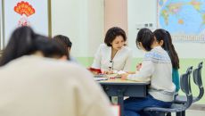 북경한국국제학교 학생들과 자리한 김혜경 여사