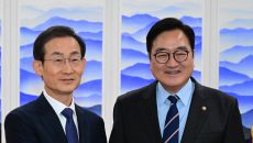 아시아투데이 이병화 기자 = 우원식 국회의장이 7일 국회를 찾은 김호철 신임 감사원장과 인사를 나누고 있다. ⓒ "젊은 파워,- 2026-01-07 15:41