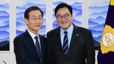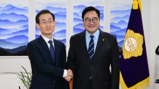 아시아투데이 이병화 기자 = 우원식 국회의장이 7일 국회를 찾은 김호철 신임 감사원장과 인사를 나누고 있다. ⓒ "젊은 파워,- 2026-01-07 15:41