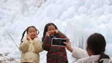 (대구=뉴스1) 공정식 기자 = 7일 오후 대구 달성군 유가읍 비슬산자연휴양림 얼음동산을 찾은 어린들이 꽁꽁 언 빙벽 앞에서- 2026-01-07 14:08
