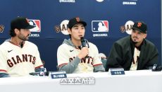 미국 메이저리그 샌프란시스코 자이언츠의 토니 비텔로 감독(왼쪽)과 이정후(가운데), 윌리 아다메스가 7일 경기도 이천 LG챔피- 2026-01-07 14:08