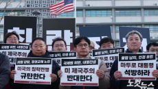 7일 오전 서울 종로구 주한미국대사관 앞에서 '자원강탈과 정권교체 노린 전쟁범죄자 트럼프 규탄! 미 제국주의 침략전쟁 중단 촉- 2026-01-07 10:52