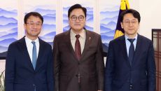 [이용우 기자] (서울=국제뉴스) 한병도 더불어민주당 원내대표가 12일 오전 우원식 국회의장을 예방하고 기념촬영을 하고 있다.- 2026-01-12 15:57