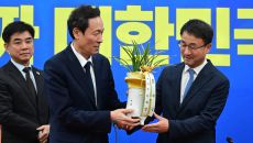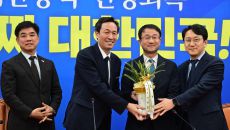 아시아투데이 이병화 기자 = 한병도 더불어민주당 신임 원내대표가 12일 이재명 대통령의 축하 난을 들고 국회를 찾은 우상호 청- 2026-01-12 15:02