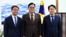 우원식 국회의장(가운데)이 12일 국회에서 한병도 더불어민주당 신임 원내대표(왼쪽), 천준호 신임 원내운영수석부대표와 기념촬영- 2026-01-12 12:18