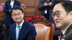 우원식 국회의장(가운데)이 12일 오전 서울 여의도 국회 의장실에서 더불어민주당 한병도(왼쪽) 신임 원내대표, 천준호(오른쪽)- 2026-01-12 11:23