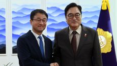 아시아투데이 송의주 기자 = 우원식 국회의장(오른쪽)이 12일 국회 의장실에서 한병도 더불어민주당 신임 원내대표와 만나 기념촬- 2026-01-12 11:06