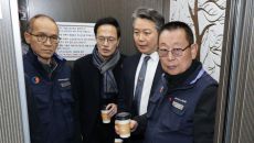 엘리베이터에서 서울시내버스 노조대표와 대화하는 박주민 더불어민주당 국회의원