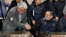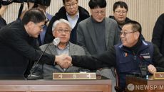 김정환 서울시버스운송조합 이사장과 악수하는 박점곤 서울시버스노동조합 위원장