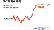8거래일 연속 상승 4692선 피지컬AI 전환 선언 기대감 현대차 급등 첫 40만원 돌파 한화 등 방산주도 고공행진 코스피 상- 22시간전
