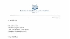 고양소방서가 지난 8일 주한 싱가포르 대사관으로부터 공식 감사 서한을 받았다고 밝혔다. 서한은 지난해 11월 7일 오후 6시경- 16시간전